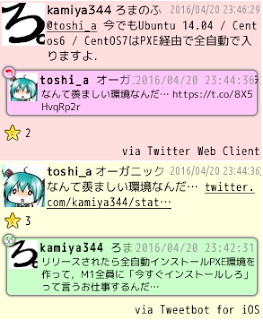mikutter 3.4からは、リプライも共通のパーツを使います。全く同じだと当然見分けが付かないので、小さいアイコンを表示するのと、背景色も変えています。色は設定で変更できます。